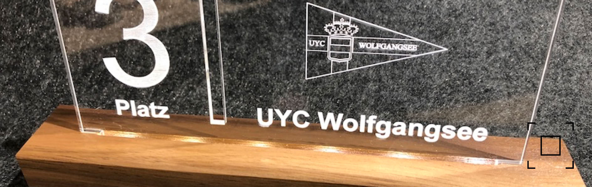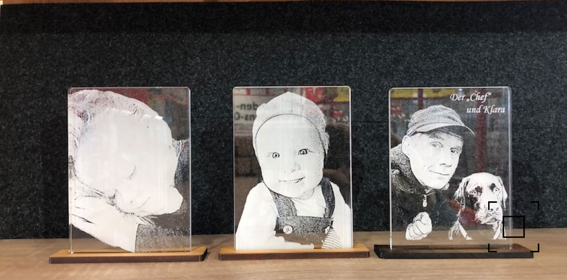 Eine Plexiglasplatte wird graviert und entfaltet im Holzständer mittels einer LED Leiste seine Leuchtkraft.